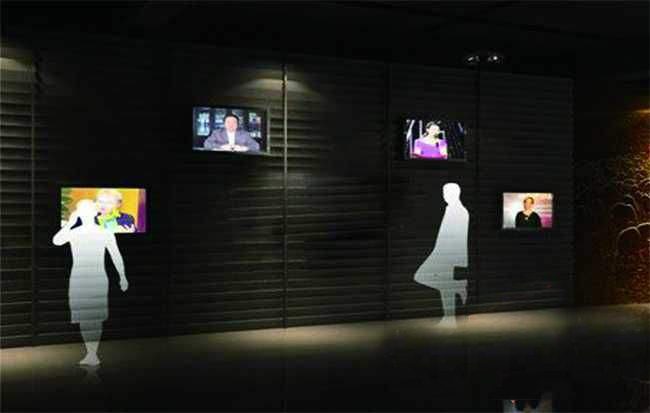 觀眾看到墻面上多個(gè)顯示設(shè)備中,每個(gè)顯示畫面中都有人物的視頻靜止影像。每臺電視下都有一個(gè)控制按鈕(可以是自動感應(yīng)器),當(dāng)觀眾按到其中一個(gè)時(shí)(當(dāng)自動感應(yīng)器撲捉有人接近 ……